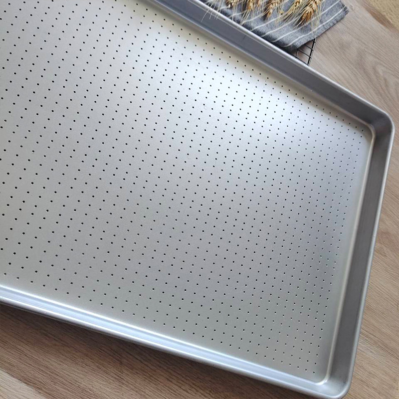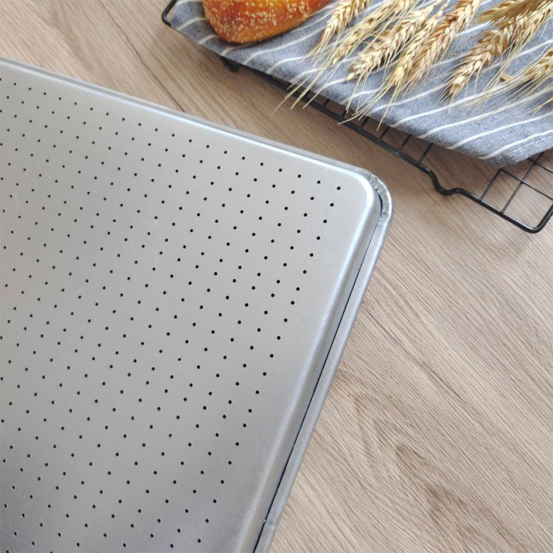 • According to the customer's needs, we can customize the rounded corner perforated baking sheet of different materials.Stainless steel is not easy to rust and easy to clean.Aluminum has good thermal conductivity, the product is heated evenly, and the draw pattern effect is good. Aluminum steel have beautiful appearance, suitable for bread rounded corner perforated baking sheet.